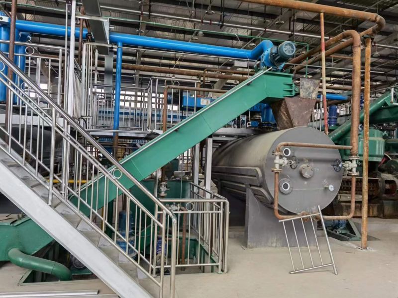 層蝶式汽提塔是國內(nèi)浸出油廠使用較多的一種汽提設(shè)備。若按照水蒸氣對混合油的汽提次數(shù),層蝶式汽提塔可分為單段式和雙段式兩種。雙段蝶式汽提塔,它主要有頂蓋、上塔體、中塔體、下塔體以及底蓋所組成。在上塔體和下塔體內(nèi)各有6-9組碟盤。每組碟盤都由滯流盤、錐形分配碟和環(huán)形分配碟組成。上、下塔體的外殼均裝有夾套,在夾套中通入343-441kPa的加熱蒸汽對塔內(nèi)的混合油進行間接加熱。中塔體和底盤內(nèi)各有一組直接蒸汽噴入裝置。這組裝置由集油盤、導(dǎo)流管、中心管、直接蒸汽噴管組成。來自第二蒸發(fā)器的混合油,進入層蝶式汽提塔的進油管之后,自上而下逐次流經(jīng)每一組碟盤。到達中塔體的集油盤底的阻攔,被汽提出的溶劑蒸汽和水蒸氣繞過集油盤向上移動,而油被阻留落下。之后,混合油又沿著下塔體內(nèi)的各組碟盤逐次流下,到達底蓋內(nèi),在直接蒸汽噴入裝置中又一次被汽提,汽提出的溶劑蒸汽和水蒸氣自下而上逐級通過每一組碟盤的空隙,與碟盤表面流下的液膜狀混合油充分接觸,使混合油得到進一步汽提。到達頂部的混合蒸汽通過出氣管進入汽提冷凝器。經(jīng)汽提后的浸出毛油從底部的出油管通過液封裝置排出。層蝶式汽提塔結(jié)構(gòu)較為簡單,操作方便,工藝效果好。但是必須注意的:每一組碟盤的制造質(zhì)量和是否水平安裝,將影響混合油液膜的形成與氣液相接觸的面積;直接蒸汽含水,會造成毛油中磷脂的析出;直接蒸汽壓力過高或者用量過大,會形成液泛現(xiàn)象;混合油中含雜太多,則使汽提塔碟盤表面的結(jié)垢現(xiàn)象嚴重,毛油質(zhì)量降低;若采用多段式,應(yīng)使上層直接蒸汽壓力低于下層。直接蒸汽好采用低壓過熱蒸汽。層蝶式汽提塔在檢修時碟盤的清理比較麻煩。